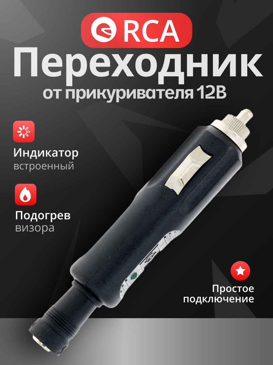 Универсальный переходник от розетки "прикуривателя" 12В на штекер RCA провода питания визора шлема с подогревом (мотоочков с подогревом, накладки на сидушку, муфт руля и других устройств с подогревом с аналогичным разъемом). В корпусе встроен предохранитель и светодиодный индикатор работы. Металлические части переходника обработаны антикоррозийным покрытием.