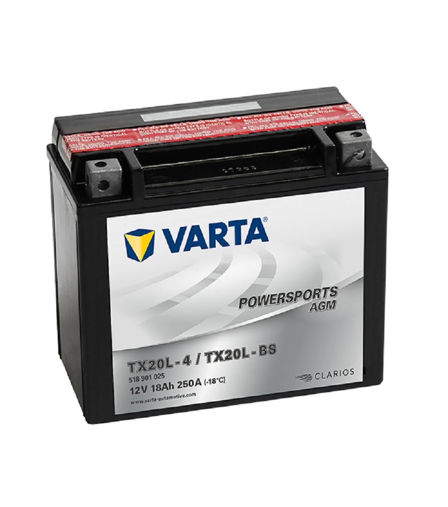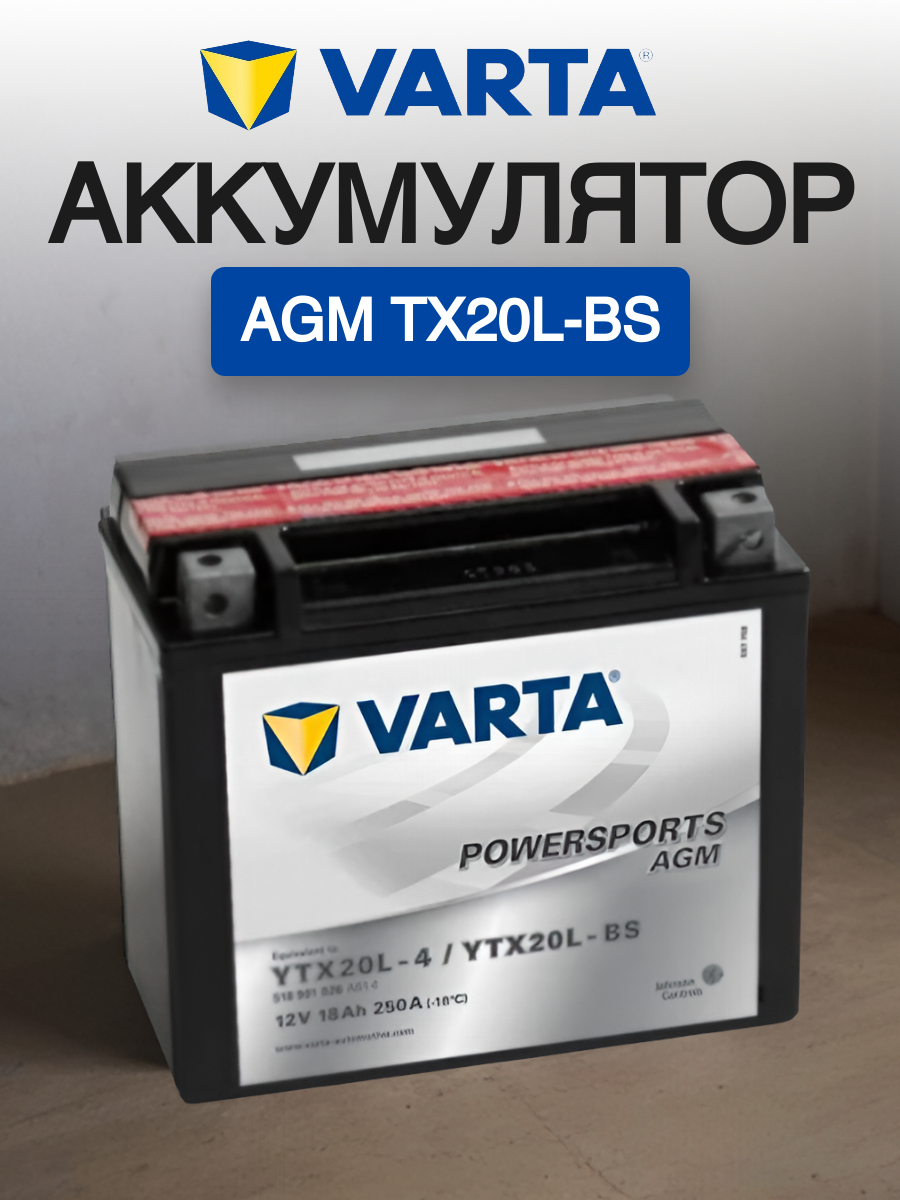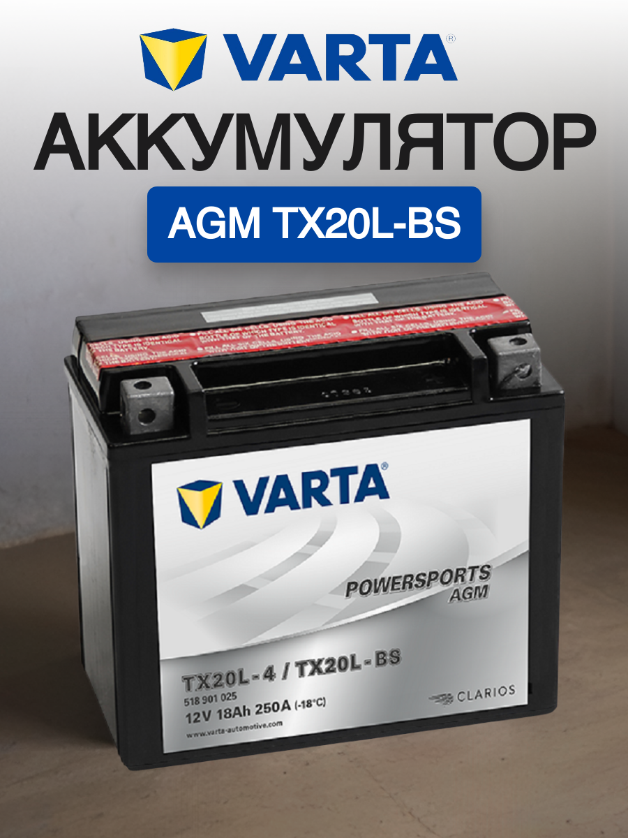 Аккумулятор VARTA Powersports AGM TX20L-BS 18 Ач (12v 18Ah) 12 вольт для мотоциклов, квадроциклов и другой мото техники. АКБ мотоциклетный VARTA 18 Ah 12v (гелевый), создан по технологии AGM с абсорбирующим стекловолокном без жидкого электролита. Обладает высокой пусковой мощностью, герметичный корпус позволяет эксплуатировать батарею в экстремальных условиях. Преимущества Прочная конструкция полюсных выводов предотвращает вытекание электролита, крышка и корпус устойчив к маслу и бензину. Надежная пусковая мощность в жаркую или холодную погоду. Прочная конструкция, выдерживающая вибрацию во время поездки по ухабистым дорогам Комплектация Мото аккумулятор Варта AGM 18Ач 12в () свинцово-кислотный поставляется сухозаряженный в комплекте с электролитом, это удлиняет срок хранения до ввода в эксплуатацию до 5 лет. Процедура заправки батареи электролитом занимает 10-15 минут, после заливки выждите 30-40 минут и аккумулятор готов к эксплуатации.Артикул: 2040371722802; В000350570