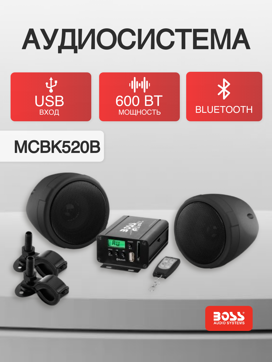 Влагозащищенная активная акустическая система для применения на мотоциклах, мотовездеходах, скутерах и лодках. Особенности: Черные 3-дюймовые влагозащищенные динамики Беспроводное дистанционное управление Встроенный FM-тюнер 87,5…108 МГц Слот SD (до 32 Гб) и вход USB (до 32 Гб) с автовоспроизведением Встроенный модуль Bluetooth с поддержкой потокового аудио Аудиовход 3,5 мм для MiniJack, cовместимый с аудиовыходами смартфонов и mp3-проигрывателей В комплекте монтажные скобы от 0,75» до 1,25» Характеристики: Класс встроенного усилителя : AB Максимальная мощность, Вт : 600 Частотный диапазон, Гц : 20 — 20000 КГИ, % : <0,1 Сигнал/шум, дБ : >50 Разделение каналов, дБ : >50 Напряжение питания, В : 12 (допускается от 10 до 16)Артикул: MCBK520B; В000301180