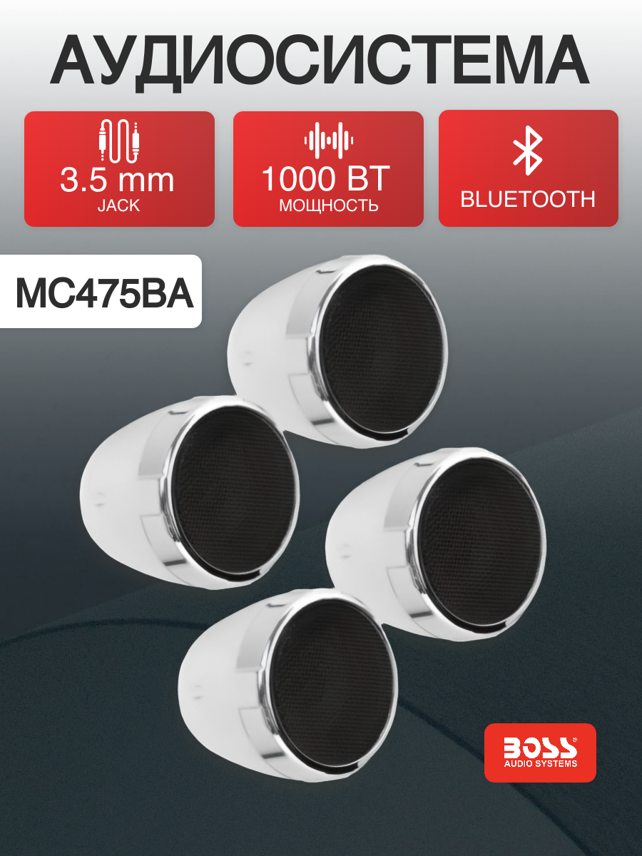 Аудиосистема мото Boss Audio 1000W, Bluetooth, 4x3'', хром (MC475BA) Источник звука подключается к системе через стандартный 3.5 mm jack. Изменение громкости происходит с помощью миниатюрного регулятора. Аудиосистема для мотоцикла MC475BA BOSS AUDIO обладает действительно мощным и самое главное объёмным звуком. УСИЛИТЕЛЬ ВСТРОЕН В ДИНАМИК! Поддержка Bluetooth В модели Boss Audio MC475BA звук можно передавать без проводов через Bluetooth, т.е. ваш мобильный телефон или плеер на 100% будут в безопасности. Особенности системы: Встроенный Bluetooth модуль 4 динамика 3" + усилитель 600 Вт (пиковая) Водонепроницаемый проводной регулятор громкости 3,5 мм аудио вход AUX Подходит для 12V мотоциклов, скутеров и лодок Питание: 12 В Размер динамика: 3" Частотный диапазон: 80Hz to 15KHz Гарантия: Официальная гарантия 12 месяцев Дополнительно: Поддержка BluetoothАртикул: MC475BA; В000339111