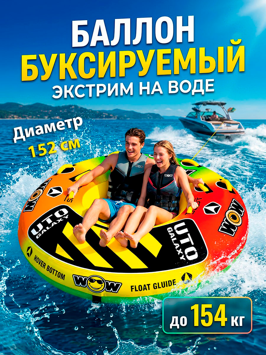 Буксируемый за катером (гидроциклом) надувной баллон американского производителя World of watersports. Предназначен для катания не более 2х человек с общей массой не более 154 кг. Буксировочный фал в комплект не входит.