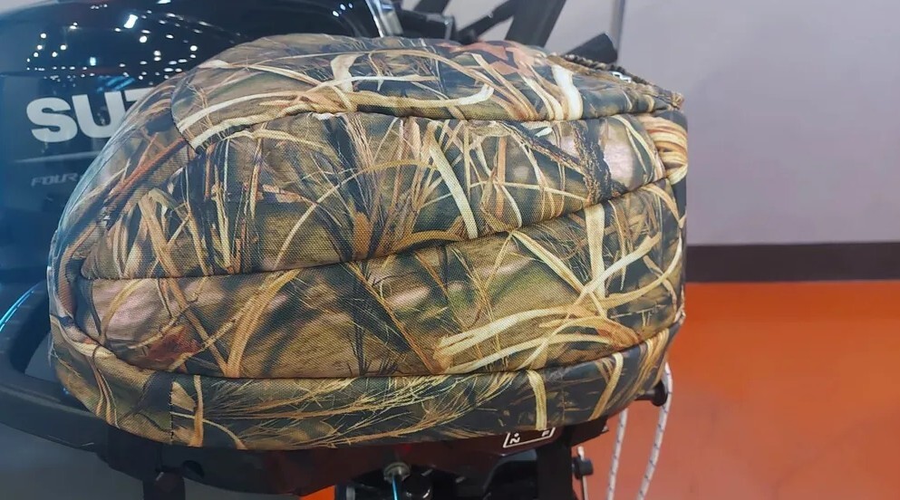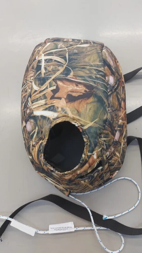 Надежное крепление на моторе обеспечивает шнурковая затяжка по низу чехла. Камуфляжная раскраска придает интересный внешний вид, дает скрытность при охоте на дичь.
