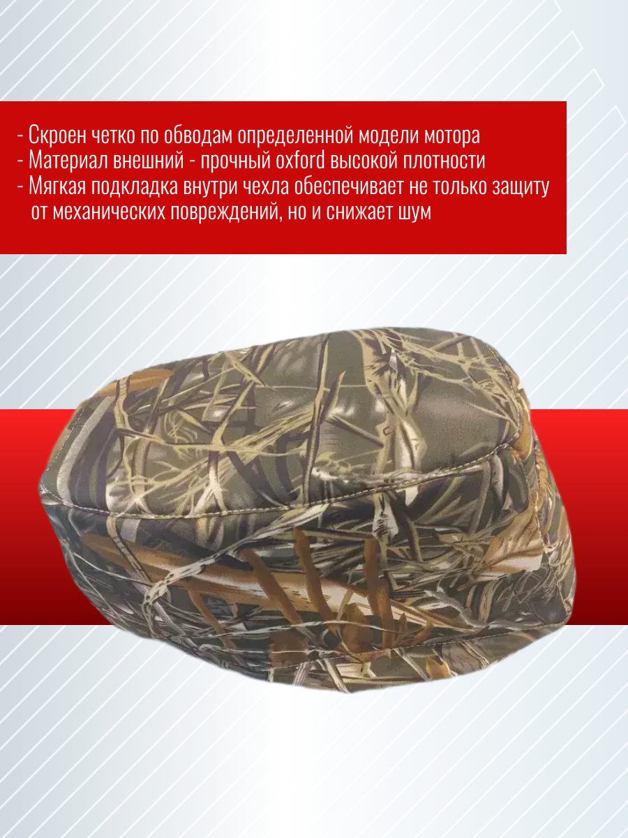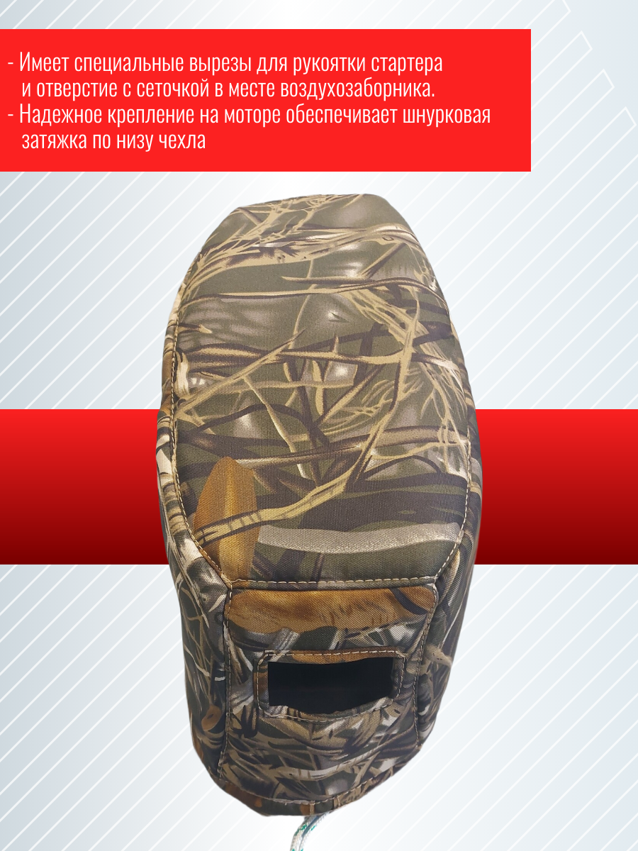 Чехол колпака лодочного мотора Tohatsu M 9,9/15/18 камуфляж камыш REI-Toh15/18-camo Защитный чехол на капот подвесного лодочного мотора. Скроен четко по обводам определенной модели мотора (и китайских копий). Материал внешний - прочный oxford высокой плотности. мягкая подкладка внутри чехла обеспечивает не только защиту от механических повреждений, но и снижает шум. Имеет специальные вырезы для рукоятки стартера (для ручного запуска) и отверстие с сеточкой в месте воздухозаборника. Надежное крепление на моторе обеспечивает шнурковая затяжка по низу чехла. Камуфляжная раскраска придает интересный внешний вид, дает скрытность при охоте на дичь.