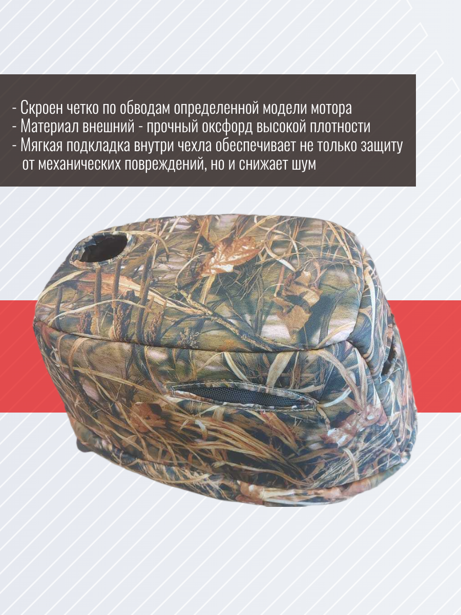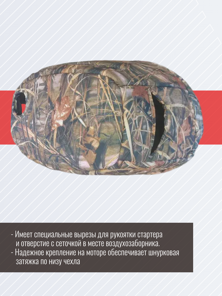 Защитный чехол на капот подвесного лодочного мотора. Скроен четко по обводам определенной модели мотора. Материал внешний - прочный oxford высокой плотности. мягкая подкладка внутри чехла обеспечивает не только защиту от механических повреждений, но и снижает шум. Имеет специальные вырезы для рукоятки стартера (для ручного запуска) и отверстие с сеточкой в месте воздухозаборника. Надежное крепление на моторе обеспечивает шнурковая затяжка по низу чехла. Камуфляжная раскраска придает интересный внешний вид, дает скрытность при охоте на дичь.