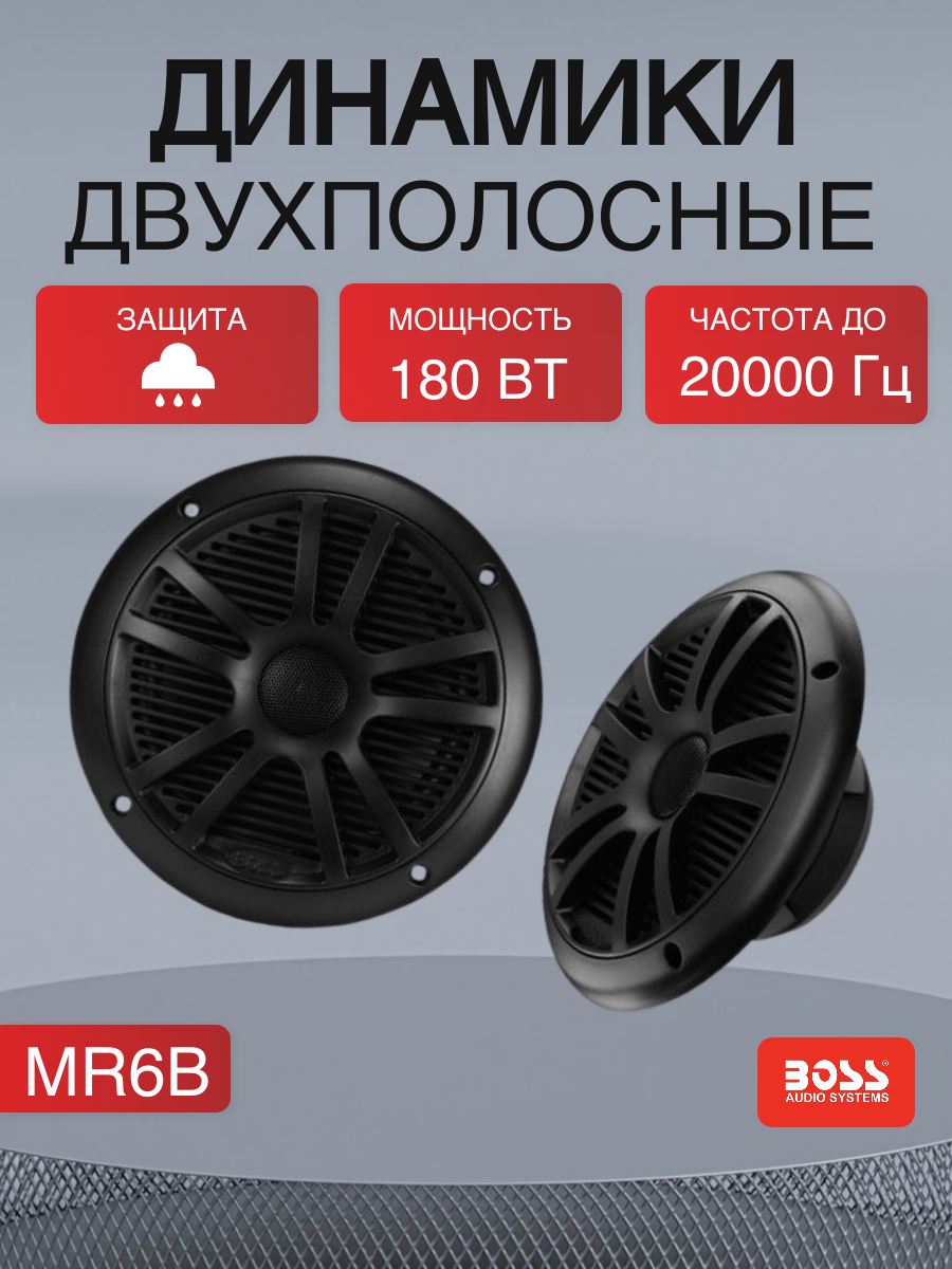 Boss Marine MR6B - это комплект из пары двухполосных всепогодных динамиков черного цвета. Модель отличается повышенной устойчивостью к агрессивным воздействиям окружающей среды (влага, пыль, соль, УФ-лучи) благодаря особенностям конструкции и используемым материалам. Рекомендуется для установки на прогулочные и спортивные катера и яхты, допустима инсталляция динамиков на другие виды открытой мототехники.