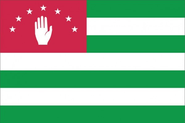 Флаг Абхазии представляет собой полотнище с четырьмя зелёными и тремя белыми равновеликими горизонтальными полосами, а также красным прямоугольником в левом верхнем углу, в котором расположена открытая белая рука и 7 белых звезд в виде полукруга над ней.