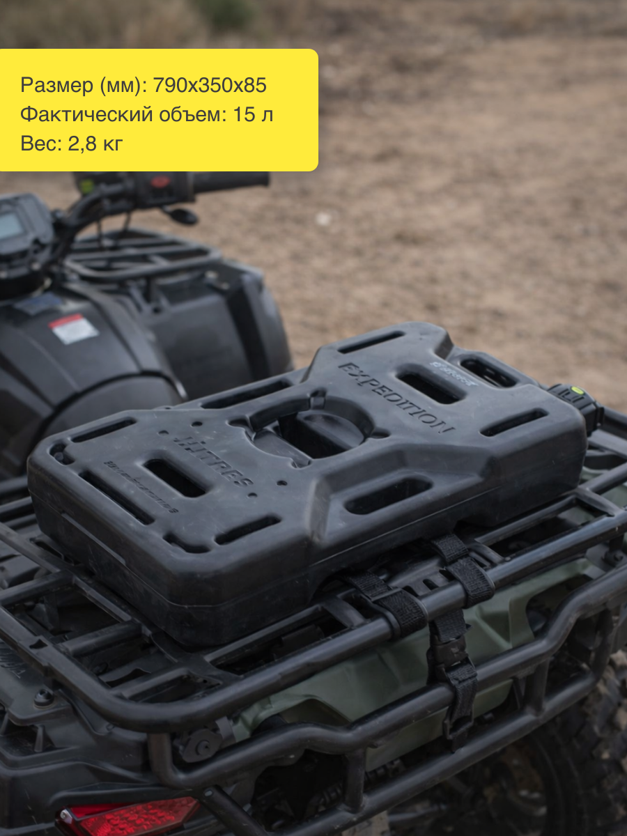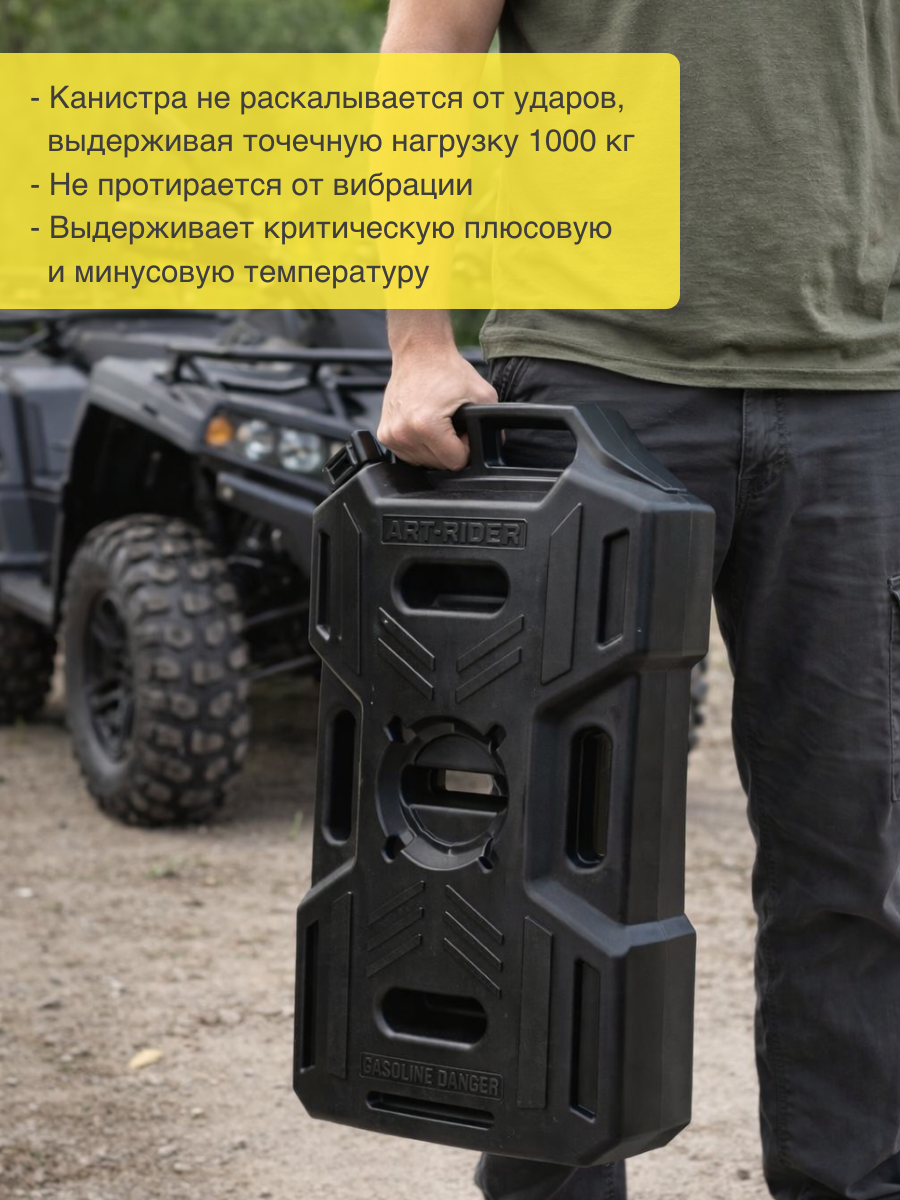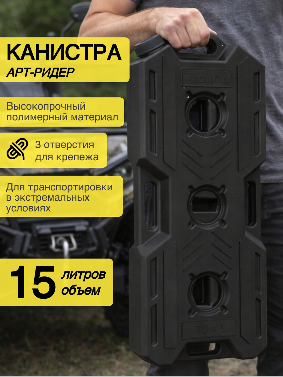 Экспедиционные канистры ART-RIDER разработаны по современным технологиям и изготовлены из высокопрочного полимерного материала. Оригинальная конструкция канистры позволяет выдерживать экстремальные нагрузки при транспортировке, в частности, канистра не раскалывается от ударов, выдерживая точечную нагрузку 1000 кг, не протирается от вибрации, выдерживает критическую плюсовую и минусовую температуру Канистры предназначены для перевозки как технических, так и пищевых жидкостей в самых экстремальных условиях. В таких канистрах обычно транспортируют: ГСМ Вода Спирт Канистра на 15 литров отлично подходит для транспортировки благодаря своей удобной плоской форме. Поместится в любом автомобиле или квадроцикле. Со всех сторон у канистры есть специальные ручки, что позволяет брать её из любого положения и не марать при этом руки. Имеются 3 отверстия для крепежа.