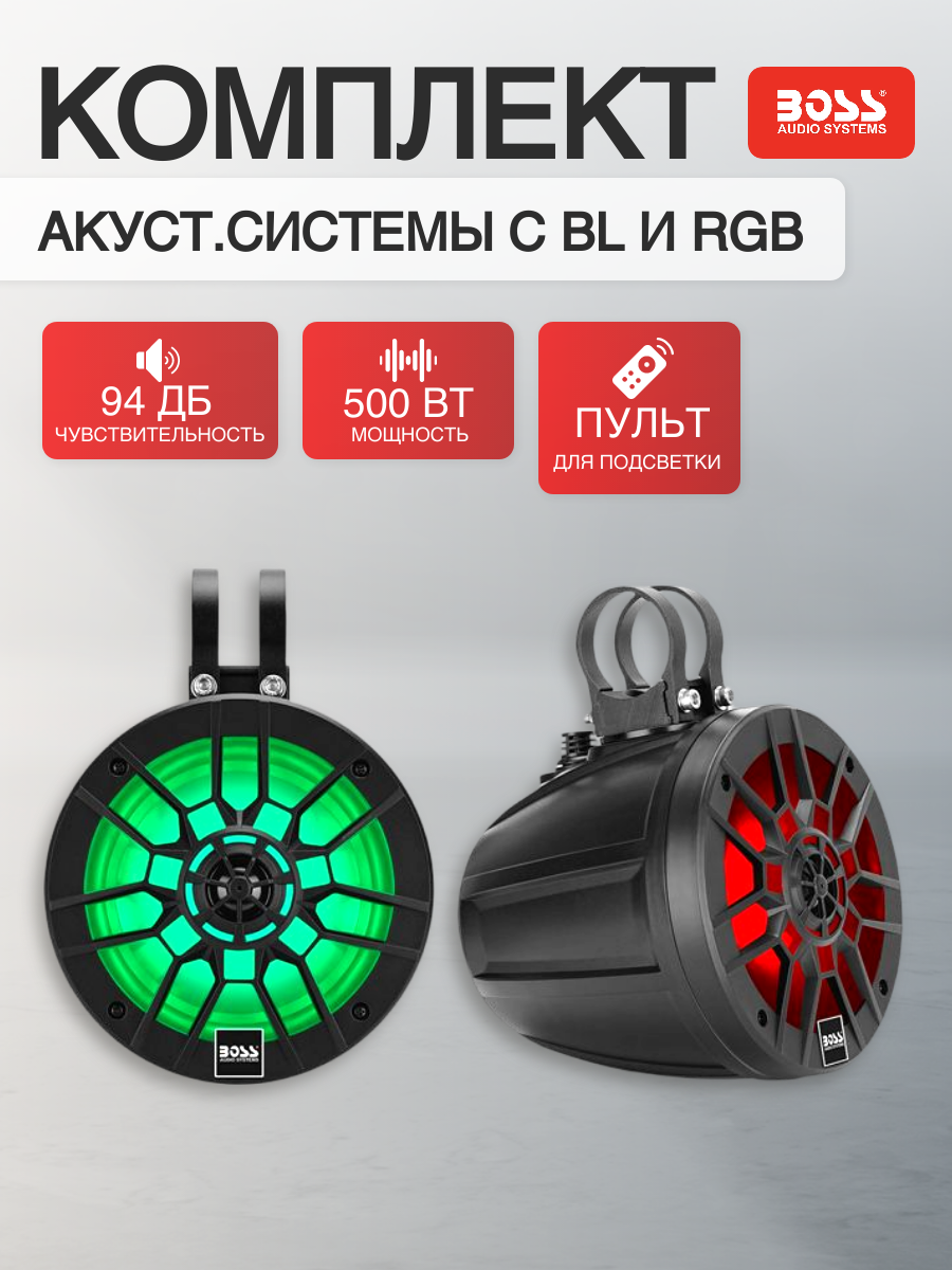 Комплект активной акустической системы BossAudio, 2 динамика 6,5" 500 Вт с BLUETOOTH и RGB B6RGB Морская акустика 6.5" с RGB подсветкой на таргу или леер. Цвет подсветки меняется с помощью беспроводного пульта управления. Характеристики: Мощность выходная: 2х125 Вт Чувствительность: 94 дБ Сопротивление акустики (импеданс): 4 Ом Диапазон частот: 60 Гц–20 кГц Степень защиты IP: X5 Цвет: Черный Подсветка: RGB Производитель: Boss Страна производителя: СШААртикул: B6RGB; В000353387