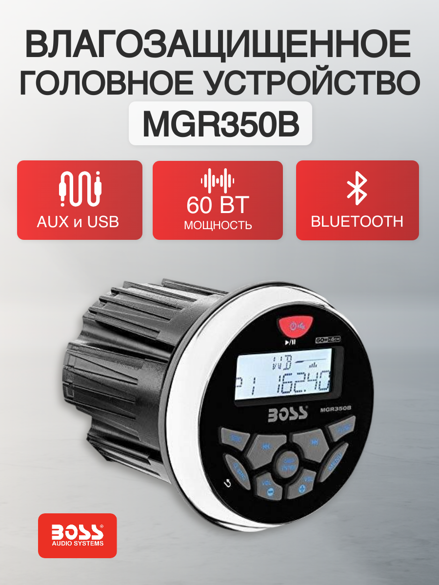 Влагозащищенное головное устройство Boss Audio Marine MGR350B, 60 Вт х4, для мотоцикла, квадроцикла, водного транспорта MGR350B Головное устройство MGR350B предлагает 60 Вт x 4 максимальной мощности (класс усилителя: АВ) и встроенный эквалайзер (классика, джаз, поп, рок, техно, вокал). Доступные настройки: баланс, бас, фейдер, сабвуфер, высокие частоты, громкость. Дополнительные возможности модели: встроенный USB-порт для зарядки, защита от перегрузки, от короткого замыкания, от атмосферных воздействий, тепловая защита. Если вам необходим стабильно качественный продукт, по разумной цене, для интенсивного использования в на открытом воздухе, мы предлагаем купить магнитолу MGR350B Босс Аудио в нашем интернет-магазине. Белый ЖК-дисплей Синяя подсветка Воспроизведение: MP3 / WMA Bluetooth Audio Streaming: поток и контроль Вашей любимой музыки APPs - Bluetooth A2DP - Потоковая передача музыки по беспроводной сети со смартфона, планшета и других Bluetooth-совместимых устройств AM / FM-тюнер Входы и выходы: Порт USB (сзади) Aux-In (сзади) Аудио выход под iPod / iPhone, смартфоны и MP3-плееры Передний выход предусилителя Задние / Sub выходы предварительного усилителя Особенности модели: USB для зарядки (1A) Влагозащищенность по стандарту IPX6 - защита от любых погодных воздействий (водяные потоки или сильные струи с любого направления, брызги, дождь) Переключаемый США и Европа частоты тюнера RDS-тюнер Плата ПК с конформным покрытием Передняя панель УФ-покрытие Ободок из полированной нержавеющей стали Нулевое потребление тока памяти (Сохраняет радио память предварительных настроек при отключении аккумулятора) Вырез Диаметр: 3 "(76 мм) Выходная мощность: 60 Вт х (4) КаналыАртикул: MGR350B; В000254809
