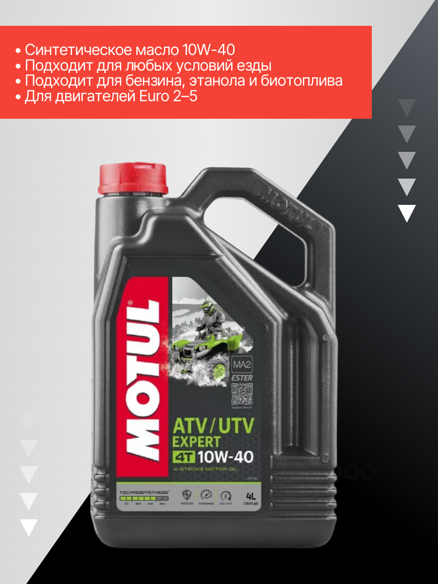 Моторное масло предназначено для утилитарных квадроциклов и мотовездеходов, оснащенных четырехтактным двигателем, который может быть совмещен с коробкой передач. Может применяться в технике с сухим сцеплением или сцеплением в масляной ванне. Применимо для двигателей, выполняющих нормы Euro 2, 3, 4 или 5, оснащенные системами нейтрализации отработавших газов: каталитическими нейтрализаторами, подачей воздуха в систему выпуска. Используется в технике для отдыха и развлечений: мотовездеходы, квадроциклы. Совместимо со всеми типами топлива: этилированный и неэтилированный бензин, этанол, биотоплива. Характеристики: Вид масла - синтетическое, ACEA - C3, Вязкость - 10W-40, API - SL; SM; SN; SN-plus; SJАртикул: 105939; В000238734