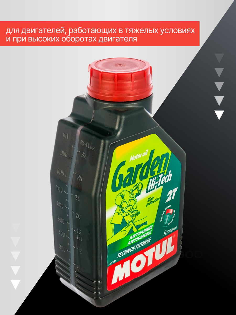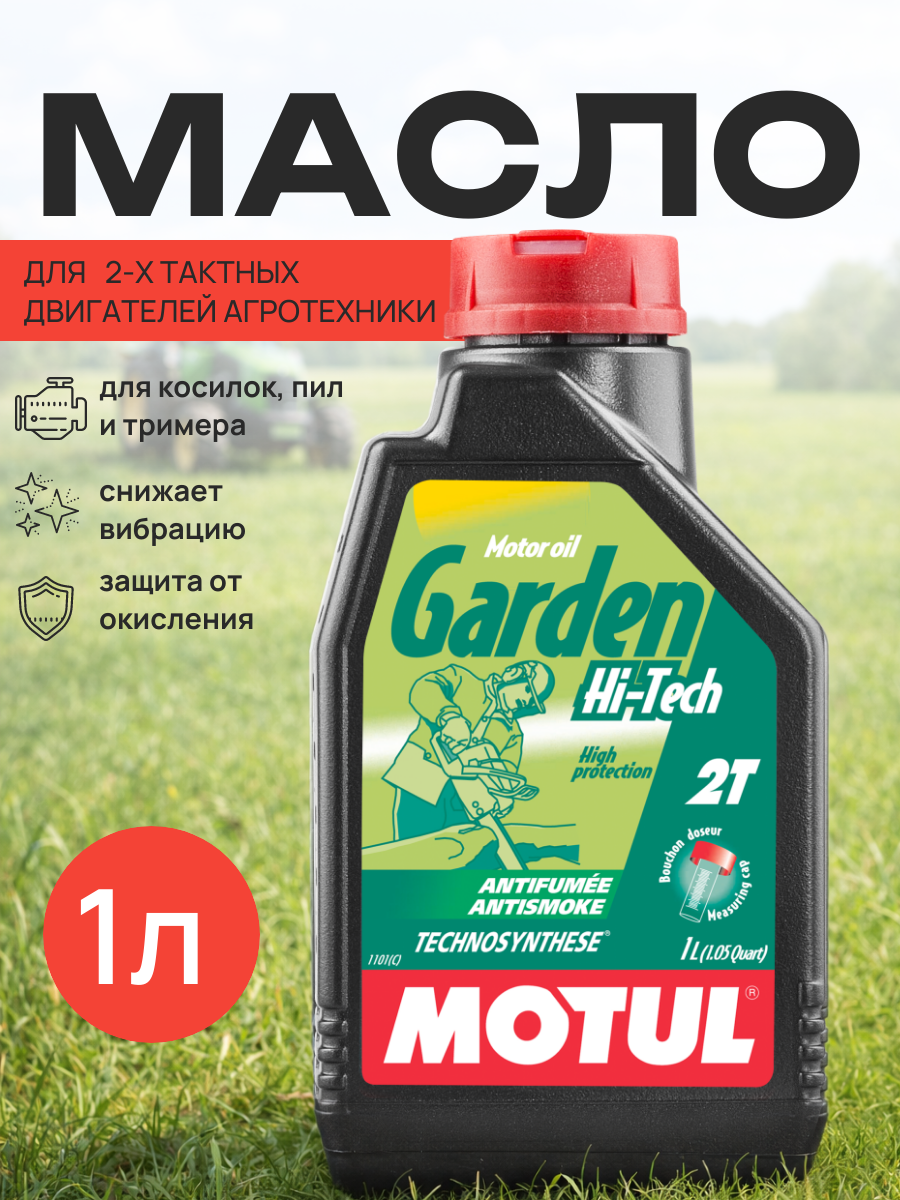 MOTUL GARDEN 2T HI-TECH - масло для 2-х тактных двигателей агротехники. Изготовлено по технологии Technosynthese(R) - полусинтетическое масло. Специально разработано для 2-х тактных двигателей агротехники. Совместимо с этилированным и неэтилированным топливом. Мотокультиваторы, раскряжевочные пилы, газонокосилки, мотокосилки… Допуски и спецификации: ISO L-EGD ; JASO FC; API ТС.Артикул: 106280; В0000104680