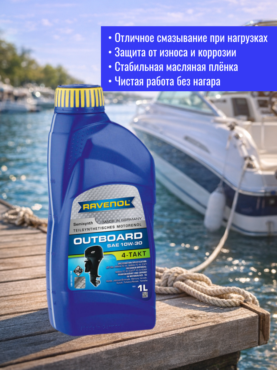RAVENOL Outboardoel 4T SAE 10W-30 – полусинтетическое моторное масло, специально разработанное для 4-тактных подвесных лодочных моторов с впрыском согласно требованиям NMMA FC-W. Обеспечивает безупречное смазывание даже при высоких оборотах и нагрузка, защиту от износа благодаря низкозольному пакету присадок, защиту от коррозии. Окрашено в синий цвет.