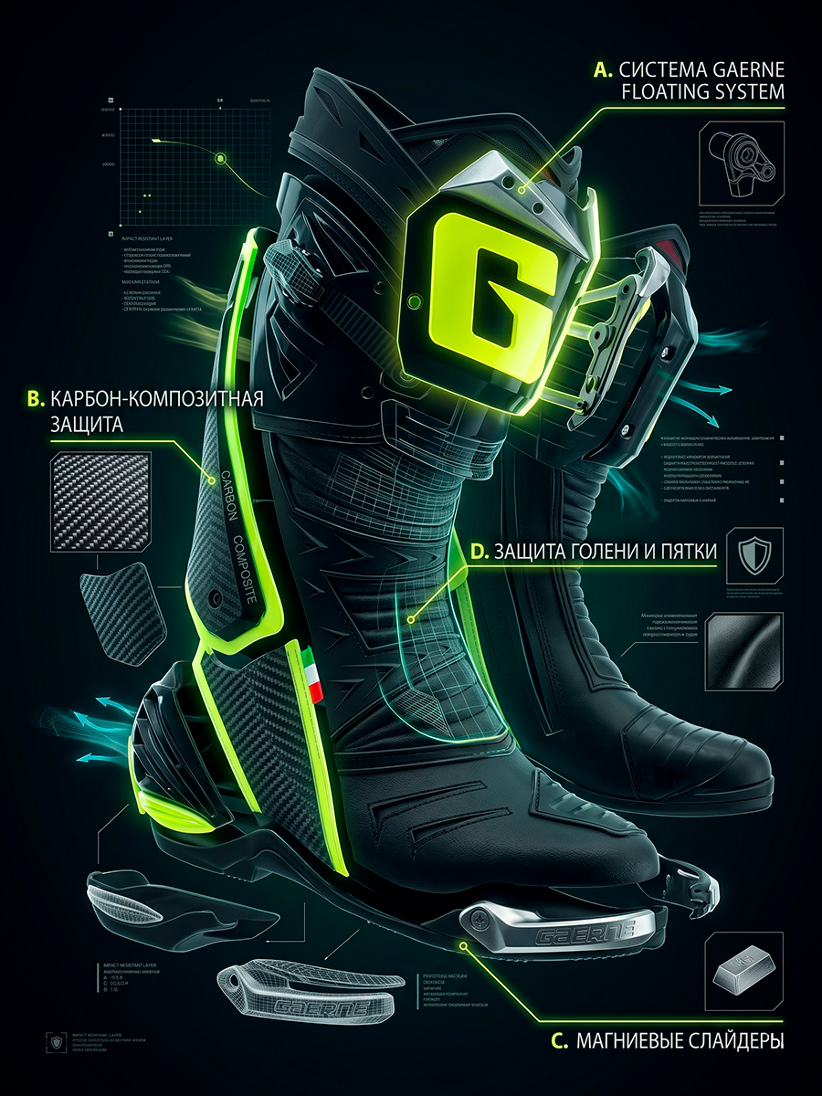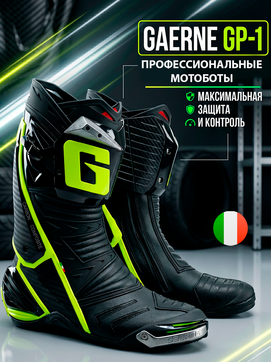GAERNE GP-1 является вершиной линейки спортивно-дорожных мотобот GAERNE. При разработке GP-1 исследователи GAERNE поддерживали тесную связь с чемпионами мотоспорта и уделяли особое внимание мелким деталям для максимального комфорта и безопасности. Использование лучших материалов и современных технологий позволяет обеспечить долгий срок службы GP-1.