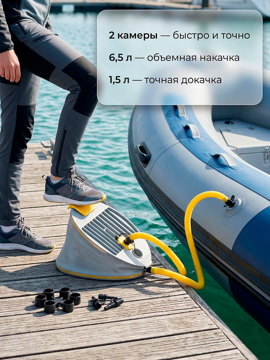 Высококачественный насос удобен при накачивании и позволяет не затрачивать много усилий при сборке лодки.