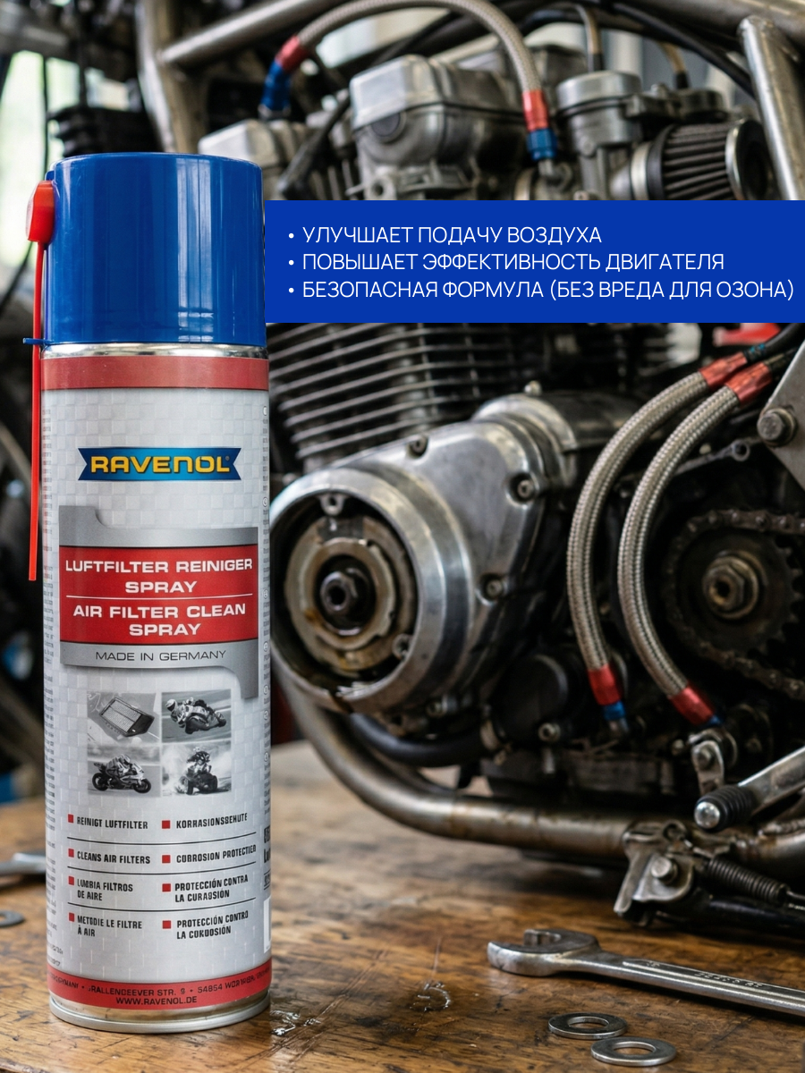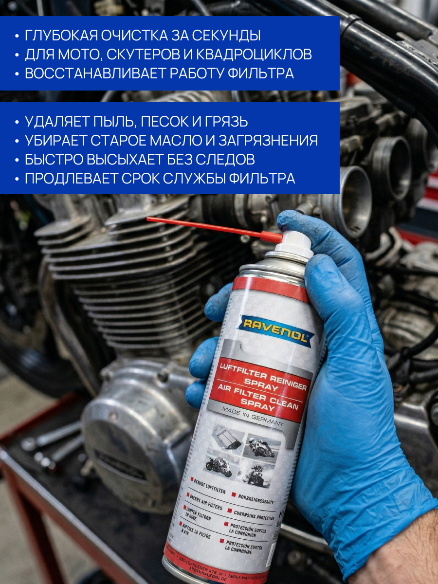 Высокоэффективный очиститель-спрей для очистки поролоновых фильтров мотоциклов, скутеров и квадроциклов. Эффективно удаляет пыль, песок, грязь и пропиточное масло. Продлевает срок службы фильтра. Ограничивает потери на усилие всасывания воздуха, повышает эксплуатационные характеристики двигателя. Быстро высыхает. Не содержит озоноразрушающих веществ, разработан на основе уайт-спирита.