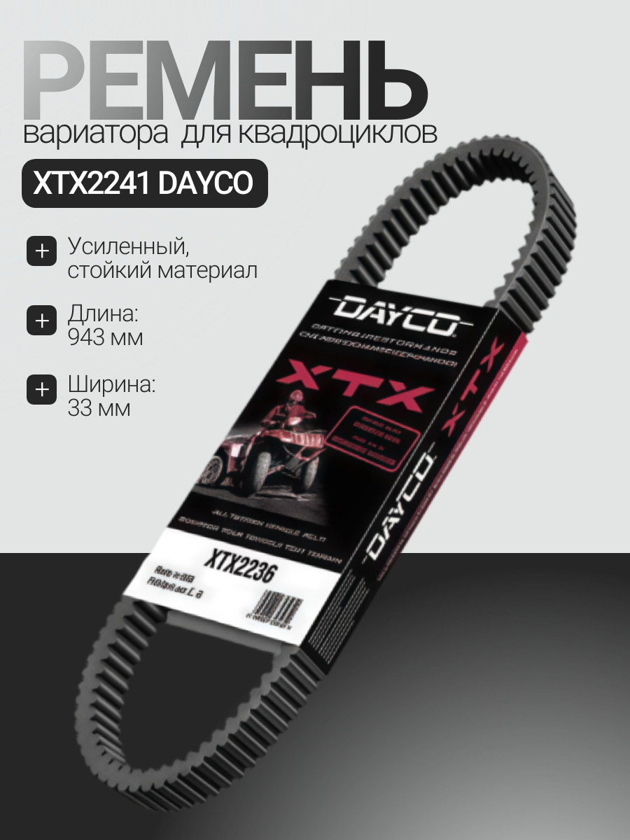 Усиленный ремень вариатора Dayco XTX2241 XTX для квадроциклов Yamaha Аналоги: Yamaha 28P-17641-00-00 / 5KM-17641-01-00 / 3B4-17641-00-00 Устанавливается на следующие модели: 2016 GRIZZLY 4WD (YFM70GDXGG) - Clutch 2016 GRIZZLY 4WD (YFM70GDXGR) - Clutch 2016 GRIZZLY 4WD HUNTER (YFM70GDHGH) - Clutch 2016 GRIZZLY 700 EPS 4WD (YFM70GPXGG) - Clutch 2016 GRIZZLY 700 EPS 4WD (YFM70GPXGL) - Clutch 2016 GRIZZLY 700 EPS 4WD (YFM70GPXGR) - Clutch 2016 GRIZZLY 700 EPS 4WD LTD EDITION (YFM70GPLGR) - Clutch 2016 GRIZZLY 700 EPS 4WD SE (YFM70GPSGB) - Clutch 2016 GRIZZLY EPS 4WD HUNTER (YFM70GPHGH) - Clutch 2016 KODIAK 700 4WD (YFM70KDXGG) - Clutch 2016 KODIAK 700 4WD (YFM70KDXGR) - Clutch 2016 KODIAK 700 4WD HUNTER (YFM70KDHGH) - Clutch 2016 KODIAK 700 EPS 4WD (YFM70KPXGG) - Clutch 2016 KODIAK 700 EPS 4WD (YFM70KPXGL) - Clutch 2016 KODIAK 700 EPS 4WD (YFM70KPXGR) - Clutch 2016 KODIAK 700 EPS 4WD HUNTER (YFM70KPHGH) - Clutch 2016 KODIAK 700 EPS 4WD SE (YFM70KPSGB) - Clutch 2017 GRIZZLY EPS 4WD LE (YFM70GPLHR) - Clutch 2017 GRIZZLY EPS 4WD SE (YFM70GPSHS) - Clutch 2017 KODIAK 700 4WD (YFM70KDXHG) - Clutch 2017 KODIAK 700 4WD (YFM70KDXHR) - Clutch 2017 KODIAK 700 4WD HUNTER (YFM70KDHHH) - Clutch 2017 KODIAK 700 EPS 4WD (YFM70KPAHL) - Clutch 2017 KODIAK 700 EPS 4WD (YFM70KPXHG) - Clutch 2017 KODIAK 700 EPS 4WD (YFM70KPXHR) - Clutch 2017 KODIAK 700 EPS 4WD HUNTER (YFM70KPHHH) - Clutch 2017 KODIAK 700 EPS 4WD SE (YFM70KPSHL) - Clutch 2007 GRIZZLY 700 (YFM7FGPW) - Clutch 2007 GRIZZLY 700 DUCKS (YFM7FGPDUW) - Clutch 2007 GRIZZLY 700 HUNTER (YFM7FGPHW) - Clutch 2007 GRIZZLY 700 OUTDOORSMAN EDITION (YFM7FGPOHW) - Clutch 2007 GRIZZLY 700 SPECIAL EDITION-SILVER (YFM7FGPSEW) - Clutch 2008 GRIZZLY 700 (YFM7FGXGR) - Clutch 2008 GRIZZLY 700 (YFM7FGXL) - Clutch 2008 GRIZZLY 700 (YFM7FGXR) - Clutch 2008 GRIZZLY 700 DUCKS UNLIMTED EDITION (YFM7FGPDUX) - Clutch 2008 GRIZZLY 700 EPS HUNTER (YFM7FGPHX) - Clutch 2008 GRIZZLY 700 POWER STEERING (YFM7FGPXGR) - ClutchАртикул: 212028; В000258782