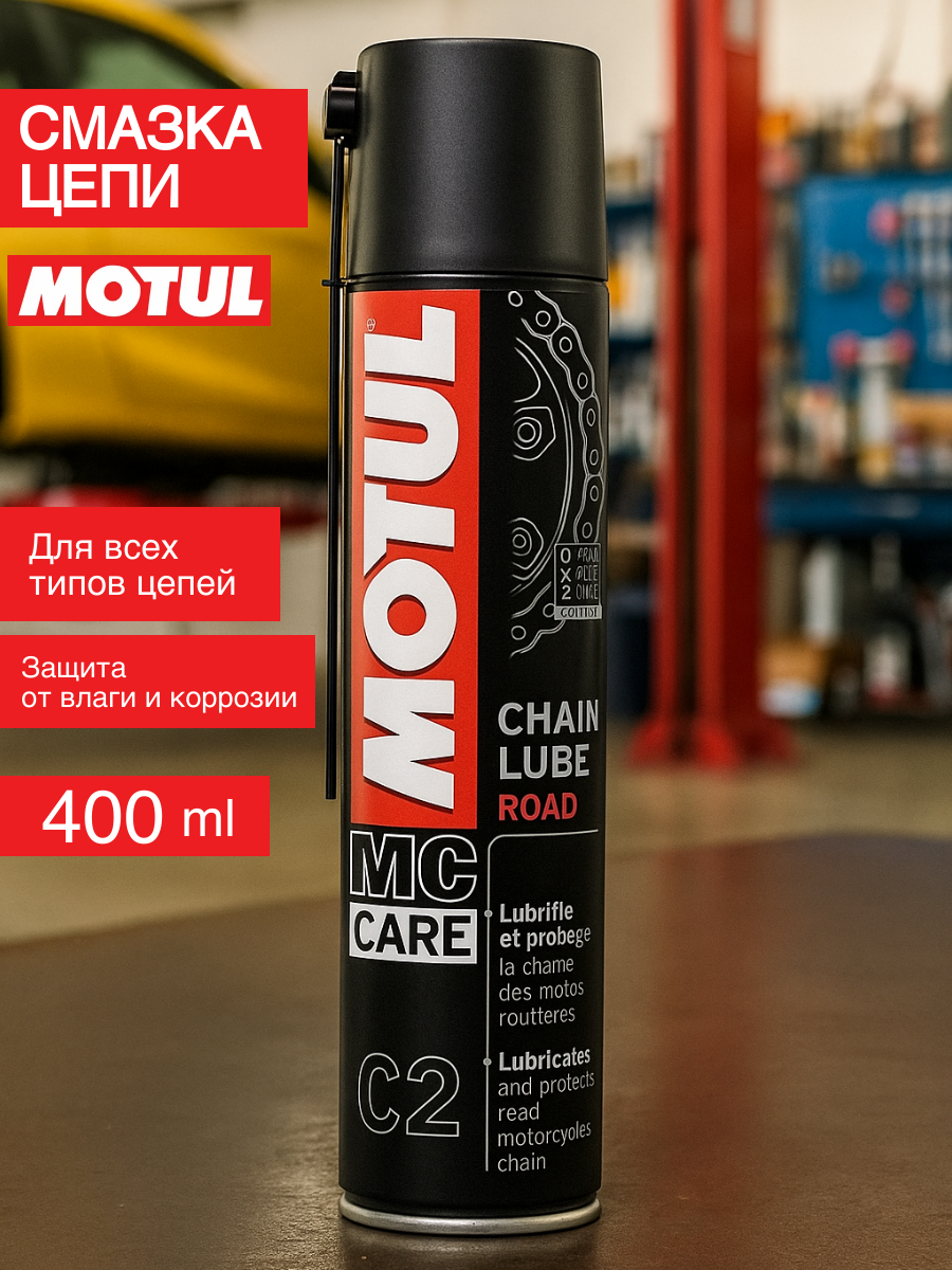 1) смазка Motul Chain Lube Road, предназначенная для всех типов цепей дорожных мотоциклов и картов, в том числе сверхскоростных.
