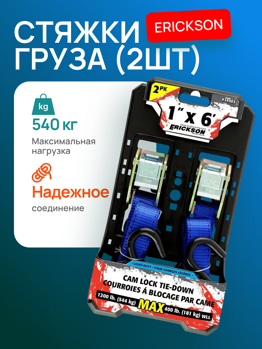 2 стяжки грузов длиной максимальной 183 см и шириной 25 см. Максимальная нагрузка - до 544 кг. Крючки с обрезиненным покрытием, механизм затяжки ручной (быстрый), покрыт антикоррозийным покрытием. Оптимально для крепежа мототехники в кузове (прицепе) или для крепежа габаритных грузов на багажнике авто.