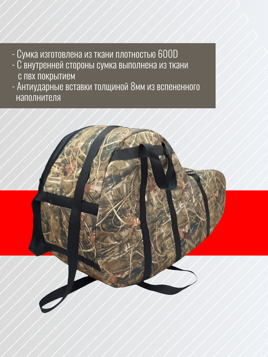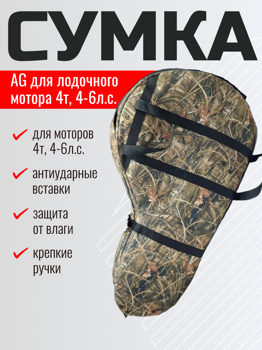 Сумка для лодочного мотора 4т, назначение: переноска и хранение лодочного мотора. Сумка изготовлена из ткани плотностью 600den с влагоотталкивающей пропиткой. С внутренней стороны сумка выполнена из ткани с пвх покрытием и имеет противоударные вставки толщиной 8 мм из вспененного наполнителя. Сумка на прочной двухзамковой молнии и имеет карман для документации и мелких деталей. Есть ручки для переноски мотора в руках и на плече. Также на сумке предусмотрены дополнительные ручки и мотор могут нести одновременно два человека.Артикул: AG-Uni-OM-N4T6-4T/6hp-600/cam; В000353811