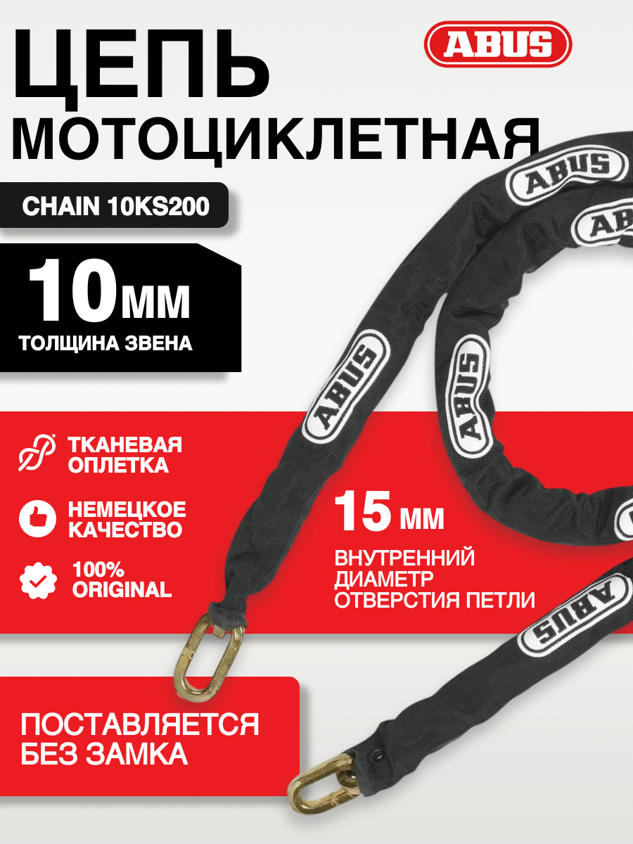 ABUS - немецкий производитель противоугонных систем для мототехники. Имя "ABUS" - синоним надежности и качества с 1924 года. Множество уникальных технологий и патентов делают ABUS лидером в своей сфере. Все производство находится только в Германии, никакого Китая. Цепи ABUS - производятся на немецких заводах, по уникальной, запатентованной технологии. Специальный сплав металлов обеспечит защиту Вашей техники. Устойчивы к перепилу, перекусу, заморозке и другим механическим повреждениям. Цепь ABUS Chain 10KS200 - цепь мотоциклетная без замка, произведена из закаленного метала, в тканевой оплетке, толщина звена 10мм. Хороший вариант если у вас уже есть замок. Рекомендуется для защиты дорогих велосипедов, скутеров, легких мотоциклов. Применение • очень хорошая протекция при высокой степени риска краж; • рекомендуется для обеспечения сохранности ценных мотоциклов Технологии и особенности Жесткая стальная цепь, толщиной 10мм, с текстильным рукавом, для предупреждения повреждений; Внутренний диаметр отверстия петли (под замок): 15 ммАртикул: 27530-2; В000239255