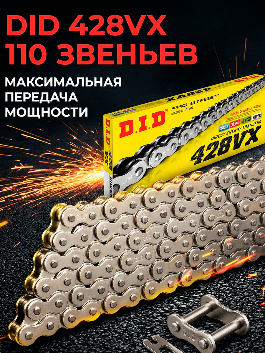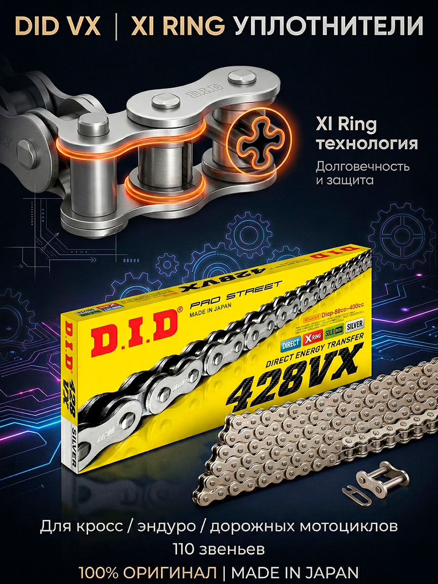 Цепь 428VX G&B (110звеньев) Цепи DID VX с сальниковыми уплотнителями предназначены для дорожных мотоциклов и использования в дисциплинах кросс, эндуро, туризм. D.I.D с гордостью представляет эту новую высокопроизводительную VX-серию. При разработке серии, D. I. D сосредоточился на улучшении жесткости. Жесткость - это способность цепи противостоять силам, которые происходят в режиме чрезвычайных нагрузок. Повышенная жесткость означает лучшую передачу мощности от двигателя к колесу и большую устойчивость к растяжению под нагрузкой. Это обеспечивает плавное управление и более быстрое время отклика. Для достижения максимальной производительности, доказанная XI Ring конструкция D. I. D обеспечивает общую улучшенную производительность, отвечающую требованиям современных высокопроизводительных машин.Артикул: 428VX G&B 110; В000353863