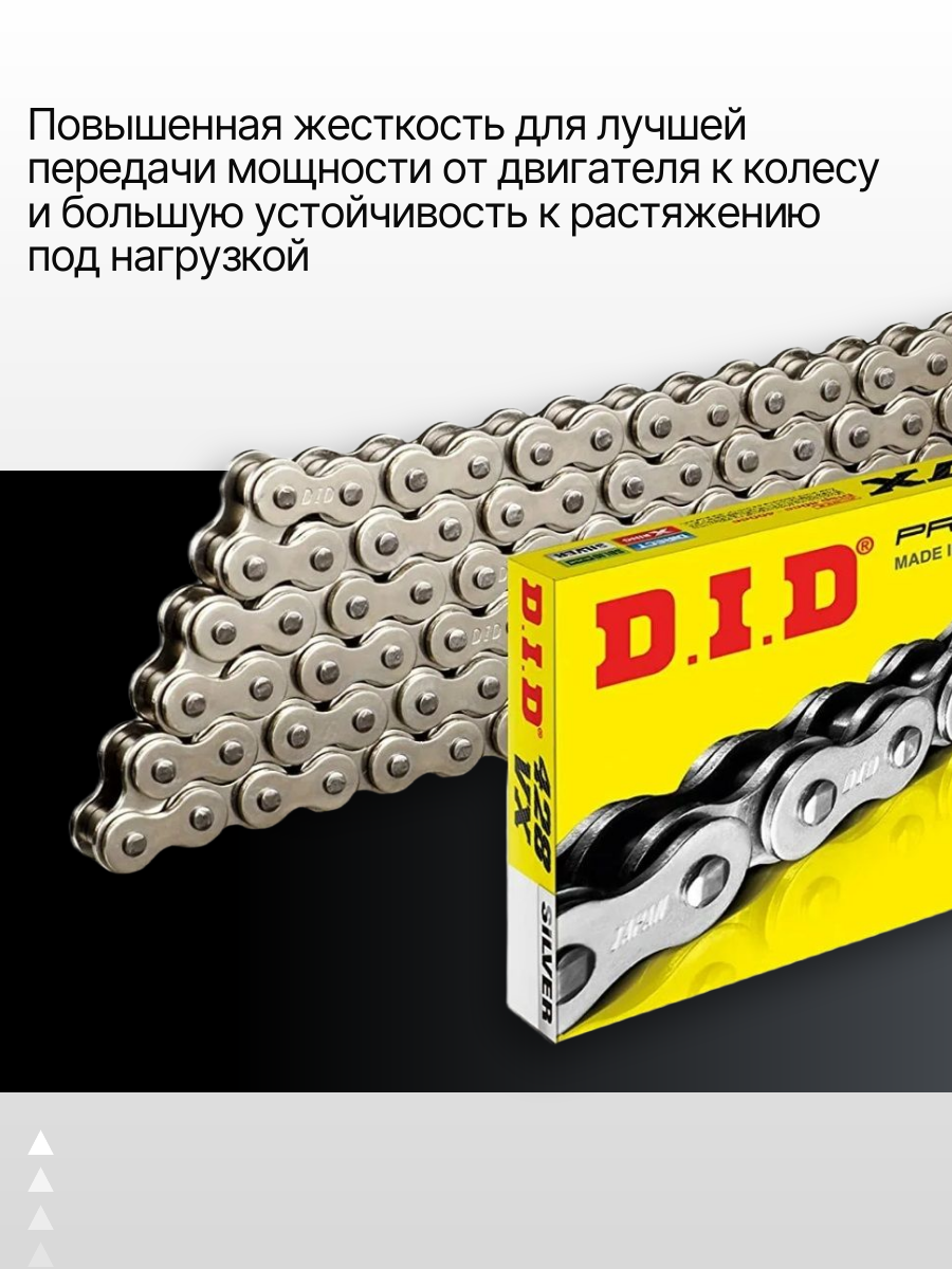 Цепь 428VX G&B (140звеньев) Цепи DID VX с сальниковыми уплотнителями предназначены для дорожных мотоциклов и использования в дисциплинах кросс, эндуро, туризм. D.I.D с гордостью представляет эту новую высокопроизводительную VX-серию. При разработке серии, D. I. D сосредоточился на улучшении жесткости. Жесткость - это способность цепи противостоять силам, которые происходят в режиме чрезвычайных нагрузок. Повышенная жесткость означает лучшую передачу мощности от двигателя к колесу и большую устойчивость к растяжению под нагрузкой. Это обеспечивает плавное управление и более быстрое время отклика. Для достижения максимальной производительности, доказанная XI Ring конструкция D. I. D обеспечивает общую улучшенную производительность, отвечающую требованиям современных высокопроизводительных машин.Артикул: 428VX G&B 140; В000353865