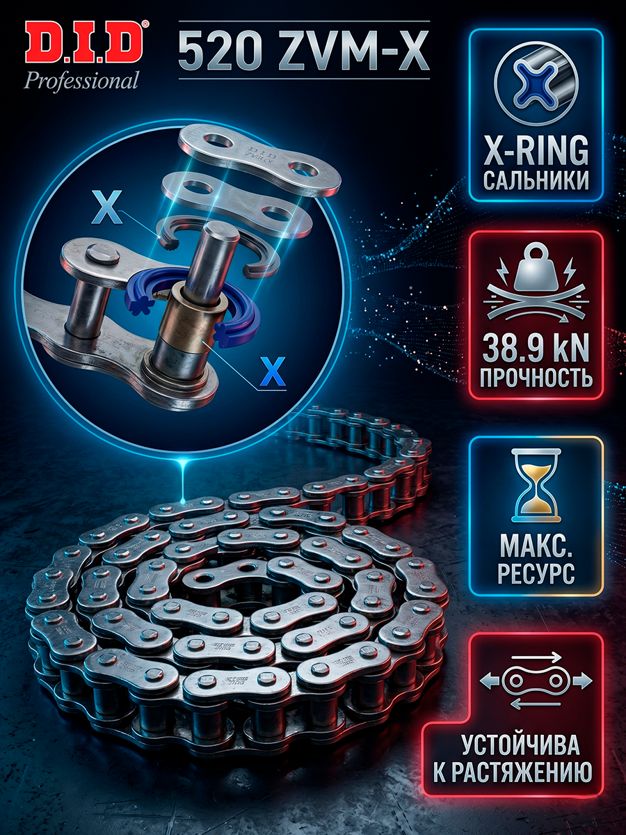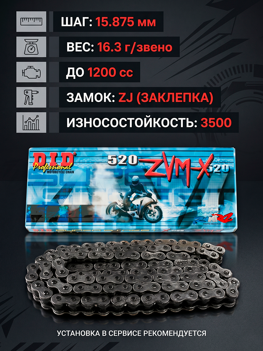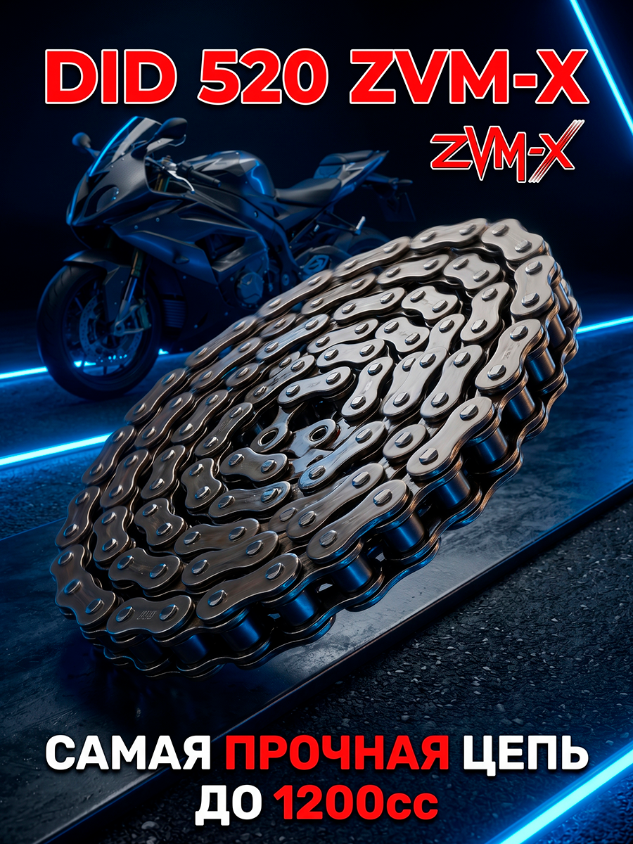 DID 520 ZVM-X - самая прочная цепь для мощных мотоциклов Цепи DID cерии 520 ZVM-X являются самыми крепкими в линейке цепей DID. Они созданы для мощных мотоциклов с объемом двигателя до 1200 куб.см, большим крутящим моментом и сотнями лошадинных сил. Серия ZVM-X появилась на основе нашего опыта в MotoGP, который позволил создать цепь с высокой устойчивостью к растяжению под нагрузкой. В цепях ZVM-X установлены сальники X-Ring. Толщина пластин цепи увеличена до максимума. Благодаря этому вы получаете цепь с максимально большим ресурсом, которая не боится любых нагрузок! Замок-заклепка ZJ обеспечивает максимально надежную фиксацию цепи. Для его установки нужен специальный инструмент для клепания цепей. Рекомендуем обратиться в специализированный сервисный центр для установки этого замка на цепь. Установка без специального инструмента подручными средствами может привести к разрушению замка и потери надежности всей цепи. Шаг цепи, мм 15,875 Внутренняя ширина, мм 6.35 Диаметр ролика, мм 10.22 Длина штифта, мм 21 Толщина внешней пластины, мм 2.2 Толщина внутренней пластины, мм 2.2 Вес одного звена, г 16.3 Максимальный объём двигателя, куб. см 1200 Прочность на разрыв, кН 38.9 Индекс износостойкости 3500 Тип сальника X-Ring Кованые втулки Да Высокая прочность Да SDH штифты Нет Тип замка Заклепка ZJАртикул: 520ZVMX 100; В000353866