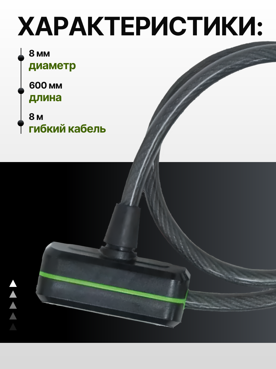Диаметр: 8 мм Длина: 600 мм Уровень защиты: 1 из 10. Гибкий кабель 8 мм для базовой защиты велосипеда Автоматический цилиндр для удобного блокированияАртикул: 73056-6; В000293135