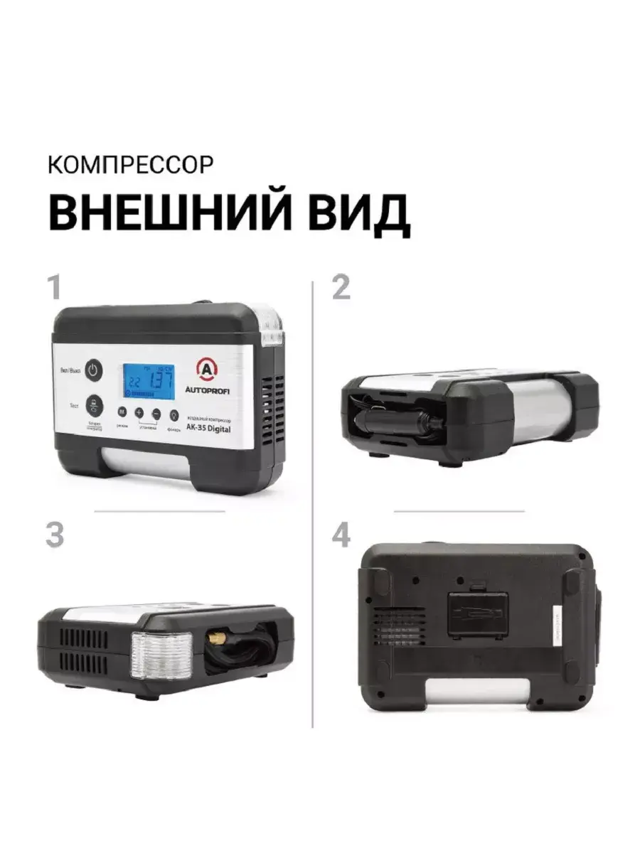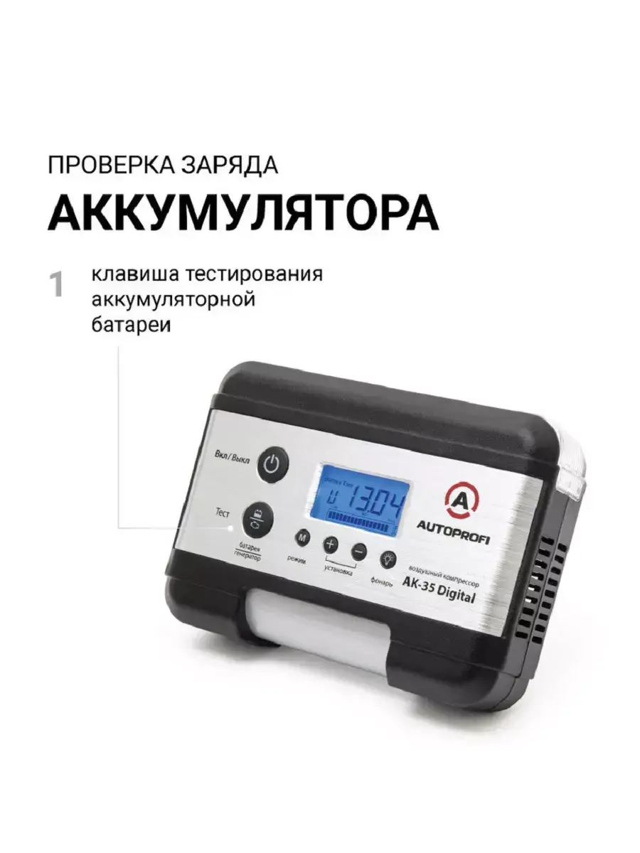 Цифровой компрессор AUTOPROFI с тестором аккум., (30 л./мин, фонарь) Многофункциональный автомобильный компрессор AK-35 Digital помимо подкачки шин умеет тестировать аккумулятор и генератор, оснащен фонариком с двумя режимами работы и автоматически отключается после достижения нужного давления в камерах покрышек. В комплекте 4 переходника для накачивания велосипедных шин, матрасов, мячей, лодок. На цифровом дисплее отображается процесс накачки шин: цифры слева показывают выставленное вручную давление, большие цифры справа показывают текущее давление, а индикатор внизу демонстрирует процент накачивания. Необходимый уровень давления, по достижению которогокомпрессор автоматическиотключается, можно задать вручную. Тест генератора или АКБ осуществляется одним нажатием кнопки. Выставленные вручную параметры компрессор запоминает в памяти. Производительность компрессора — 30 литров в минуту (0,03 м3/мин). Маленькая шина типа 135/80R13 с объемом 0,04 м3 будет готова примерно за 1,5 минуты. Характеристики Бренд - AUTOPROFI Тип - цифровые Мощность двигателя - 140 Вт Максимальное давление - 6,8 атм Производительность - 30 л/мин Длина шланга - 0,7 м Питание - от прикуривателя Встроенный предохранитель - да Время непрерывной работы - 10 мин Длина кабеля питания - 3 м Набор переходников для накачивания мячей, матрацев - да Сумка для хранения - да Максимальный ток потребления - 15 А Диаметр поршня - 30 мм Светодиодный фонарь - да Функция программируемого давления - да Режим проверки заряда аккумулятора - да Режим тестирования электрогенератора - да Вес товара(кг) - 1.92 Комплектация — Переходники для различных типов надувных изделий 4 шт. — Инструкция по эксплуатацииАртикул: AK-35 Digital; В000353900