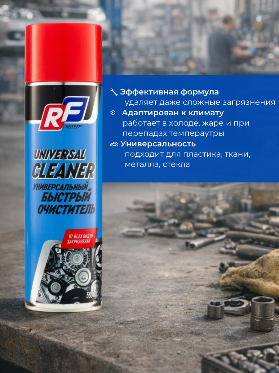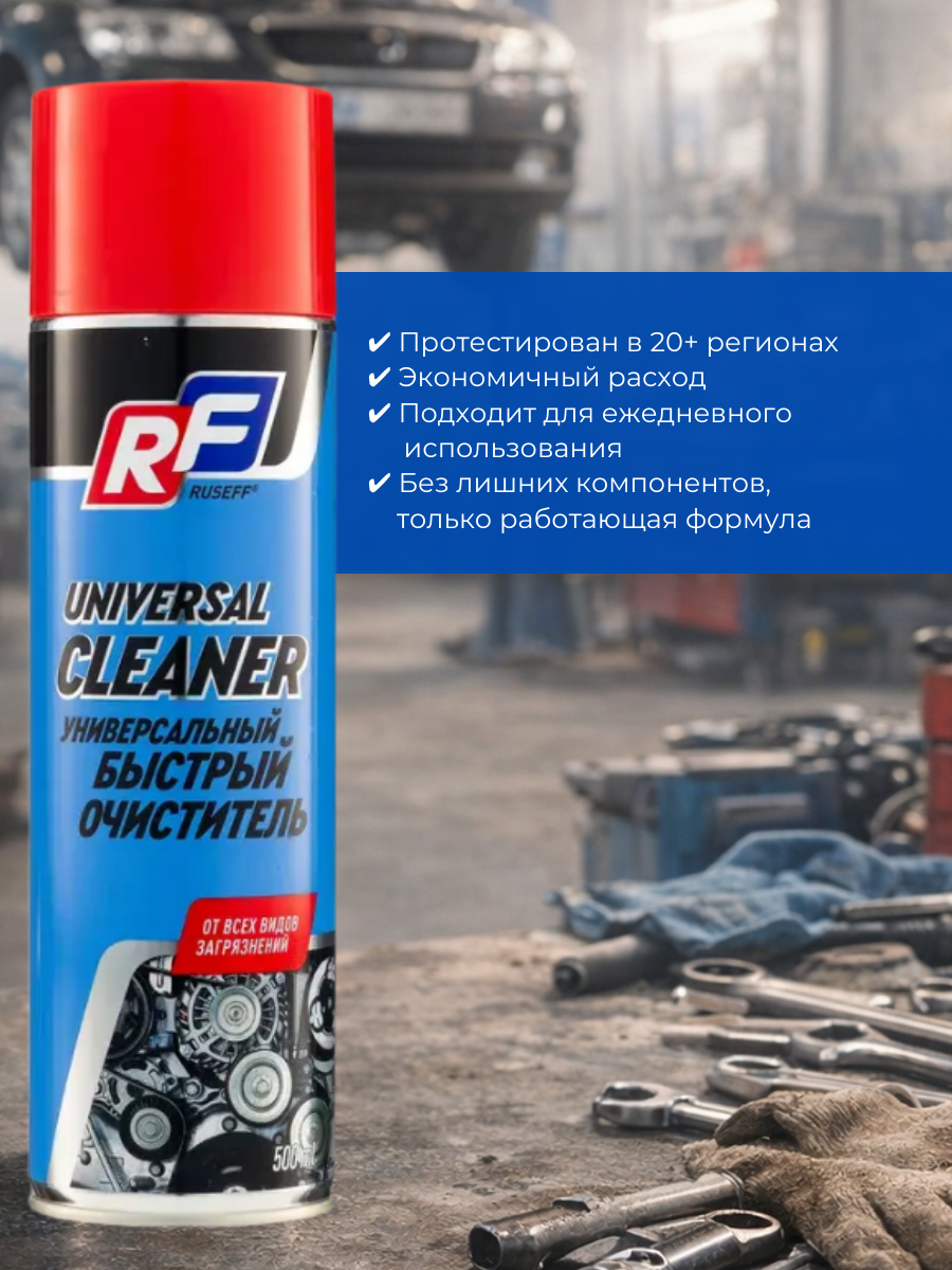 Универсальный быстрый очиститель RUSEFF 500 мл 14393N Российский - эффективный, сокращенно - RUSEFF, таким его задумали и создавали разработчики – новый современный отечественный бренд автохимии. RUSEFF – средства, которые стоят своих денег и отрабатывают их на все 100%. В первую очередь они функциональны и прагматичны, в них нет ненужных ингредиентов и накрученной стоимости. Надежные, долговечные, крепкие, но при этом простые - эти продукты имеют отличные эксплуатационные показатели. Они созданы с учетом максимальных нагрузок и суровых условий использования. Именно такой подход заложен в философии бренда RUSEFF. Мы постарались собрать все наиболее важные показатели: прогрессивные технологии в автохимии, наиболее эффективные формулы и составы, которые позволят получить максимальный результат. Мы провели испытания наших продуктов более чем в 20 регионах России, в самых разных условиях. В результате, мы предлагаем продукты, созданные специально для России, с учетом сурового климата, состояния дорог, жесткой воды и отечественного топлива. Продукты RUSEFF – это рациональные, практичные, товары для вашего автомобиля, чтобы ваша машина получала именно ту заботу, которая подходит ей наилучшим образом. Чтобы вы получали реальный результат, а не просто обещания. RUSEFF – решительно для России!Артикул: 2041610111593; В000355158