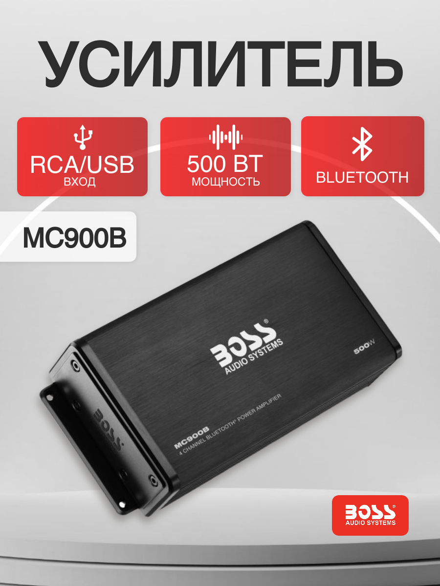 Отличный вариант для использования акустической системы без головного устройства, так как в данном усилителе есть Bluetooth, AUX, RCA и USB вход, т.е. головным устройством является ваш смартфон. Благодаря выносному пульту влагозащищенному можно управлять процессом не используя смартфон. Выходная мощность 500 Вт, 4 каналаАртикул: MC900B; В000237290