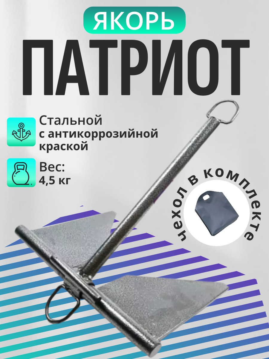 Якорь Патриот, предназначен для удержания рыбацкой лодки на воде. Подходит практически для всех лодок ПВХ. Конструкция выполнена таким образом, что минимизирует вероятность зацепов. Покрыт антикоррозийной краской. Якорь для лодки имеет два кольца: верхнее для основной веревки, а нижнее используется для привязки страховочной веревки, которая используется в случае обрыва основной или в редких случаях зацепов. Имеет отличную держащую способность на песчаных грунтах и на гальке. Поставляется якорь в специальном чехле с ручкой, который удобен, как при транспортировке, так и хранении. Артикул: 1029004; В000306405