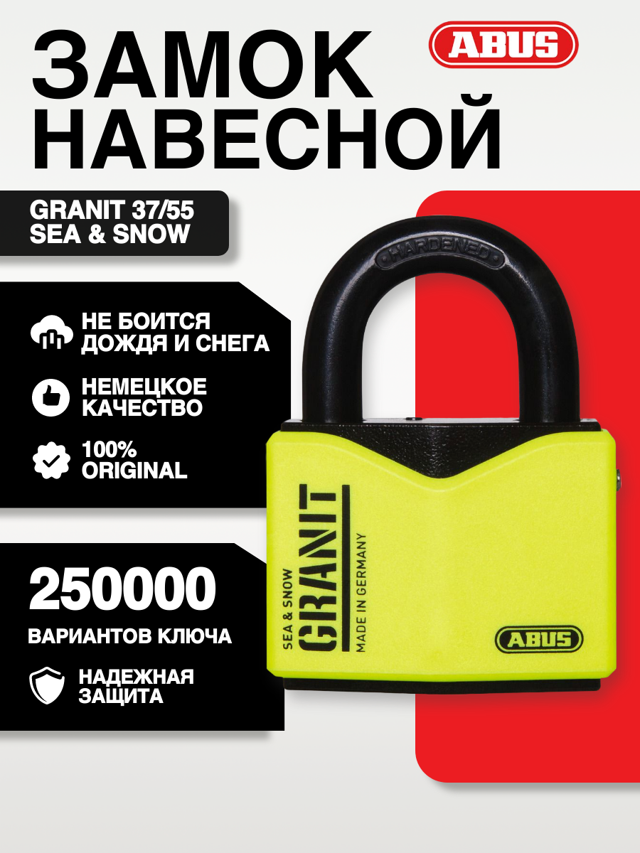 ABUS - немецкий производитель противоугонных систем для мототехники. Имя "ABUS" - синоним надежности и качества с 1924 года. Множество уникальных технологий и патентов делают ABUS лидером в своей сфере. Все производство находится только в Германии, никакого Китая. Навесные замки - используются для защелкивания цепей. Можно так же использовать не только для защиты техники, но и например как средство защиты гаража или других бытовых нужд. Замок навесной ABUS Granit 37/55 sea and snow - навесной замок, используется для защелкивания замка или защиты объекта, таких как гараж, склад, контейнер, грузовой автомобиль. Замок не боится снега или соли. Имеет 10 уровень степени защиты от производителя ABUS. Применение для обеспечения сохранности дорогостоящих складов; обеспечение сохранности объектов при очень высокой степени риска ; имеет специальные рекомендации страхующих организаций Технологии и особенности дисковый цилиндр ABUS Plus:обеспечивает максимальную точность при запирании замка против известных способов взломов, имеет 250000 различных вариантов ключа; специальная высокотехничная протекция против коррозии; двухшаровая блокировка; цилиндр можно адаптировать к имеющимся ключам, устанавливается слесарем (только RK) версия; в комплект входят два ключа, один со светодиодной подсветкой